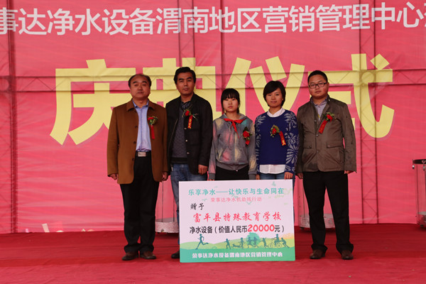 榮事達(dá)水工業(yè)公司發(fā)起的“樂(lè)享凈水——讓快樂(lè)與生命同在”助殘公益項(xiàng)目自正式啟動(dòng)以來(lái),受到全國(guó)各地代理商的鼎力支持。日前,榮事達(dá)凈水機(jī)陜西渭南營(yíng)銷(xiāo)管理中心正式落成,當(dāng)?shù)卮砩谭e極參與助殘行動(dòng),于開(kāi)業(yè)之際向富平縣特殊教育學(xué)校捐贈(zèng)了多臺(tái)凈水設(shè)備。