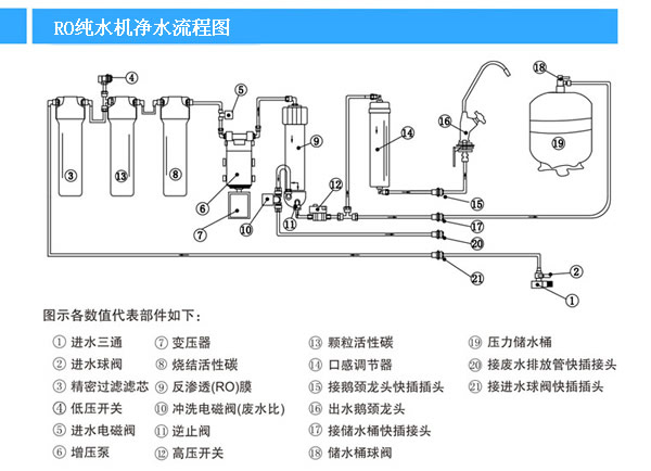原水通過水管進(jìn)入RO凈水機(jī)的前三級(jí)濾芯進(jìn)行初濾,然后在由增壓泵對(duì)水施壓,讓水流RO反滲透膜中,通過RO膜的逆滲透效果精細(xì)凈化水源,然后在將水輸送到壓力桶,由壓力桶保存;當(dāng)需要使用時(shí)在打開壓力桶球閥,通過壓力桶施壓讓水流入最后一級(jí)T33濾芯(活性炭濾芯,主要為凈化水質(zhì)口感),在通過鵝頸水龍頭產(chǎn)水詳情可參考凈水機(jī)原理。
