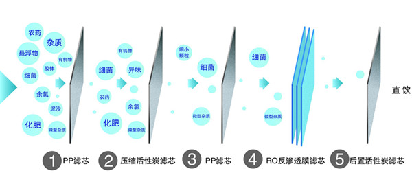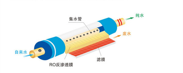 第四級(jí)是RO膜,經(jīng)過前三級(jí)濾芯處理后,水中部分較大的雜質(zhì)已經(jīng)被排除了,RO膜孔徑在0.001微米,主要去除水中除純水之外的其他細(xì)小污染物,如:細(xì)菌、病毒、余氯等。