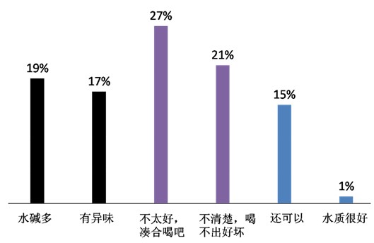 - 飲水安全,與每一個人的健康息息相關環(huán)保部不久前發(fā)布的《2013中國環(huán)境狀況公報》顯示,我國水污染狀況令人憂慮:對長江、黃河、珠江等十大水系的斷面監(jiān)測顯示,黃河、松花江、淮河和遼河水質輕度污染,海河為中度污染,而27.8%的湖泊(水庫)呈富營養(yǎng)狀態(tài)。生活中,百姓切身感受到的飲水安全問題如何?2014年6月至8月,半月談社情民意調查中心開展了“水杯里的民生:講講您身邊的生活用水”網(wǎng)絡調查,圍繞水污染程度、污染源、百姓環(huán)境權與認知,對政府的期盼等問題,與網(wǎng)友進行交流,收集有效樣本1315個。被訪者中,36%居住在城市,32%在縣城,21%來自鄉(xiāng)鎮(zhèn),11%在農(nóng)村。六成被訪者憂飲水不安全,飲水消費正成為居家“開門第八件事”——污染程度:六成被訪者對所住地區(qū)自來水的水質表示不滿,其中多數(shù)人的感受是“不太好,湊合喝吧”(27%),明顯感覺到“有異味”的有17%,感覺“水堿多”的為19%。對水質表示滿意的人很少,占全體被訪者的16%,其中15%覺得“水質還可以”,只有1%覺得“水質很好”。