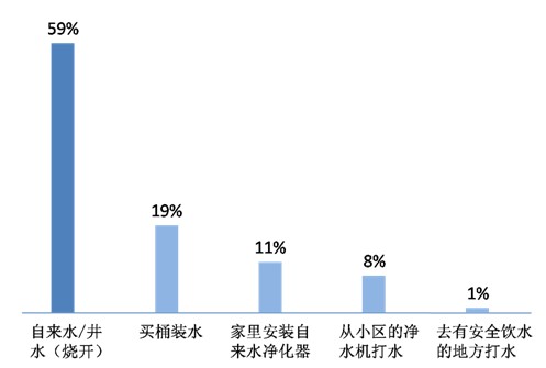 圖1. 對所住地區(qū)自來水的直觀感受另外有兩成(21%)被訪者表示“不清楚,喝不出好壞”——百姓飲用水成本越來越高,為了水杯里的安全,多數(shù)人選擇水消費:購買桶裝水、安裝自來水凈化器、從小區(qū)凈水機打水成為主流選擇,購買安全飲水正為成百姓居家繼“柴米油鹽醬醋茶”之后的“開門第八件事”。六成(59%)被訪者平時飲用水的最主要來源是“自來水/井水(燒開)”。也有不少人購買桶裝水(19%)或是從小區(qū)凈水機打水(8%)來飲用?!凹依锇惭b自來水凈化器”的被訪者也不少,為11%。