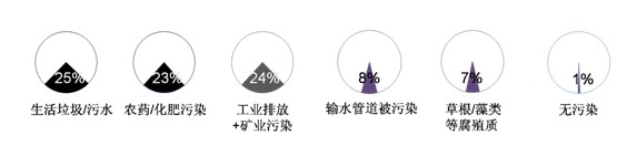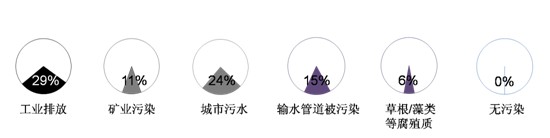 圖2. 家庭飲用水的主要來源工礦產(chǎn)業(yè)、農(nóng)藥化肥、生活污水成百姓飲水安全三大“攔路虎”本次調查分別向被訪者所感受到的城市鄉(xiāng)村的水污染情況進行了解,其中重點調查了百姓認識到的本地水污染的源頭。——污染源:城市水污染主要與產(chǎn)業(yè)結構有關,工業(yè)排放(29%)和“礦業(yè)污染”(11%)對水資源的污染占到四成。值得關注的是,“城市污水”污染被24%被訪者認為其是主要污染源。蘭州水污染事件讓人們注意到了“輸水管道被污染”對水安全造成的影響,15%被訪者認為自己所住城市的水污染受此影響。有專家分析水污染,認為“草根、藻類等腐殖質”是主要原因之一,被訪者中6%接受這一看法。