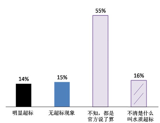 圖4. 居住在鄉(xiāng)村的受訪者對污染源的感受水安全信息“后知后覺”,百姓健康權利被透支本次調查的結果,體現(xiàn)出了水污染的嚴重程度、最主要的污染源等問題,然而比這些問題更值得關注的現(xiàn)象,是人們對攸關家人健康的環(huán)境信息的“后知后覺”、獲取水環(huán)境信息時的困難。據(jù)環(huán)保部今年3月14日發(fā)布的研究結果顯示,全國2.8億居民飲用水存在不安全問題。但是,當我們問到“據(jù)您所知,所住地區(qū)是否有飲用水超標現(xiàn)象”時,并沒能直接得到關于百姓身邊飲用水超標程度的認知結果,數(shù)據(jù)呈現(xiàn)的是人們對“飲用水水超標”問題的無奈。——對于“水杯里的飲水安全”,只有不到三成的被訪者給了我們“明顯超標”(14%)或“沒有超標現(xiàn)象”(15%)的明確答案。七成被訪者對此一片茫然:55%被訪者表示“不知道,超不超標都是官方說了算”,16%的人甚至“不清楚什么叫水質超標”。