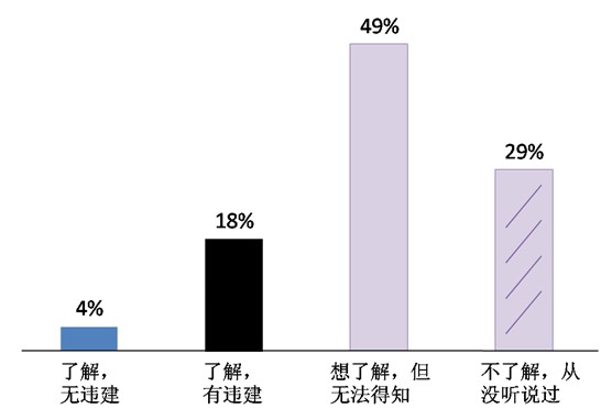 圖5. 對所住地區(qū)飲用水水質超標現(xiàn)象的感受我國劃分了飲用水水源的一級、二級保護區(qū)?!吨腥A人民共和國水污染防治法》規(guī)定,在一級保護區(qū)內,禁止與供水設施和保護水源無關的建設項目;二級保護區(qū)內,禁止排放污染物的建設項目。——對“飲用水水源保護區(qū)”這一攸關群眾飲水安全和健康權的規(guī)定,只有兩成群眾表示“了解”,并明確地告訴我們“有違建項目”(18%)或“無違建項目”(4%)。八成被訪者對此并不知曉,29%的人“從沒聽說過”,也并沒有想要了解的意愿。半數(shù)(49%)被訪者“想了解”,但無奈于“信息不透明,無法得知”。