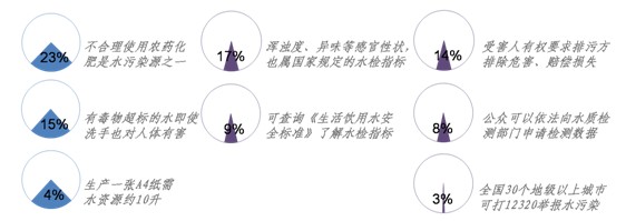 圖6. 對所住地區(qū)“飲用水水源保護區(qū)”保護情況的了解本次調查同時詢問了被訪者對一些水安全知識的認知相對而言,人們對一些科普、知識性的信息認知度較高,“過量、不合理使用化肥、農(nóng)藥是水污染源之一”已經(jīng)較為廣泛地被人們所了解(23%);不少人也清楚“汞、砷等有毒物超標的水即使只是洗手也會對人體有害”(15%),即使是“生產(chǎn)一張A4紙所需要的水資源約10升”這樣的“冷知識”,也有一定被訪者有所了解(4%)。——對于自己在水安全方面,有哪些權利、如何維護等問題,人們有所了解,但人數(shù)比例較低。例如17%知道“渾濁度、異味等感官性狀,也屬于國家規(guī)定的水質檢測指標”,而只有9%的人知道“想了解水質檢測有哪些指標,可查詢《生活飲用水安全標準》”;在維權方面,14%被訪者知道“受害人有權要求排污方排除危害、賠償損失”,8%知道“公眾可以依法向水質檢測部門申請檢測數(shù)據(jù)”,“目前全國有30個地級以上城市可撥打12320舉報水污染事件”,但只有3%的被訪者了解這一點,6%的被訪者對上述我們所提出的水安全知識表示“一概不知”。