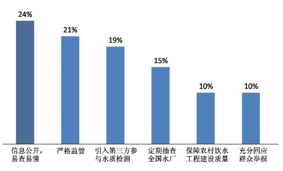 圖7. 被訪者對于水安全知識的了解情況改善“水杯民生”,當從實現(xiàn)公民環(huán)境知情權開始當我們問到“在水安全問題上,目前最希望政府做些什么”,不少被訪者選擇了“依法嚴格監(jiān)管”(21%)、“引入第三方參與水質檢測”(19%)、“定期對全國的水廠進行抽查”(15%)和“保障農(nóng)村飲水工程建設質量”(10%)。然而比起這些“管控”措施,人們最希望的是“信息公開,并使公眾易查、易懂”(24%)。這充分體現(xiàn)了百姓對于維護自身環(huán)境健康權益的強烈需求:公民環(huán)境權益的實現(xiàn),離不開最起碼的環(huán)境知情權。一個愿意對環(huán)境安全負責任的政府,在作出公民環(huán)境參與的承諾之前,理應讓每個公民對行政機關所持有的環(huán)境信息擁有適當?shù)墨@得利用權。使水污染信息真實、透明、易查易懂,這既是本次調查中百姓對于當前政府改善環(huán)境民生的迫切期待,也是中國推進公民參與的環(huán)境法治的必經(jīng)之路。