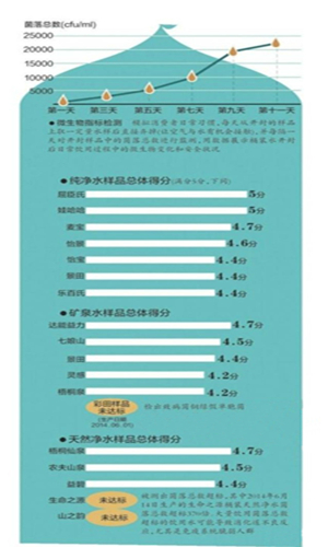 本次比較試驗還模擬日常飲用水習慣,在設計的檢測周期內,每天取一定水樣,定時監(jiān)測菌落總數(shù)。實驗中,大多數(shù)水樣隨著開瓶時間越來越長,菌落總數(shù)呈增長趨勢,開瓶第5-7天后,出現(xiàn)急劇增長態(tài)勢。
