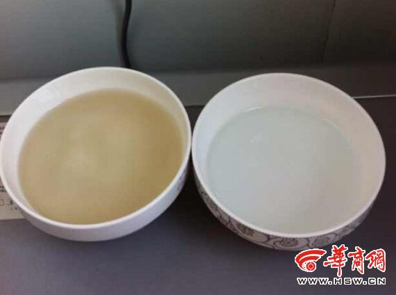 昨日下午,在該小區(qū),華商報記者看到,小楊家的自來水確實呈淡黃色,通過凈化后,水就變得清澈透明。淡黃色的水沒有氣味,喝下去也基本沒有味道。